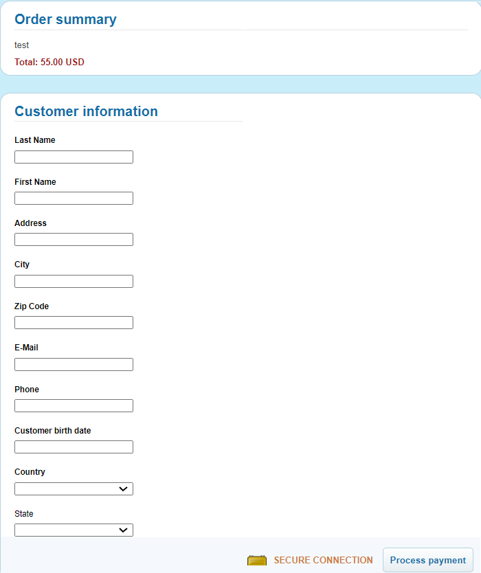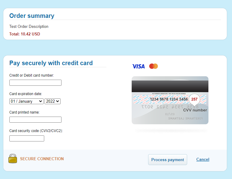 Buy Now Button integration is relevant for Connecting Party who has limited portfolio of products to sell. It is the easiest way to integrate with Processing.cc. This way of integration doesn’t require much technical effort. Buy Now Button integration also allows Connecting Party to exclude itself from storing, processing, or transmitting Payer’s cardholder data or other sensitive payment details. Such data is submitted by Payer on Processing.cc hosted customer details form and payment form in PCI DSS certified environment.