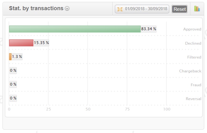 This statistics screen can be used for a visual assessment of the most frequent decline reasons, as well as chargeback and fraud reasons.