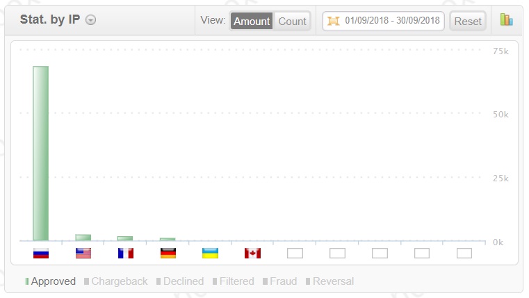 Processing.cc Payment Gateway also displays statistics per card payment system, per currency, as well as per payment method.