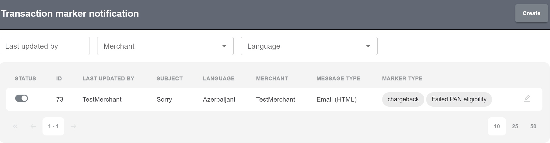 The main screen displays a list of all notifications, their status, ID, subject, language, merchant name, message type and marker type.
