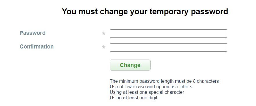 Upon initial access to Processing.cc UI, after logging in, the Merchant employee will be asked to create and enter a new password.