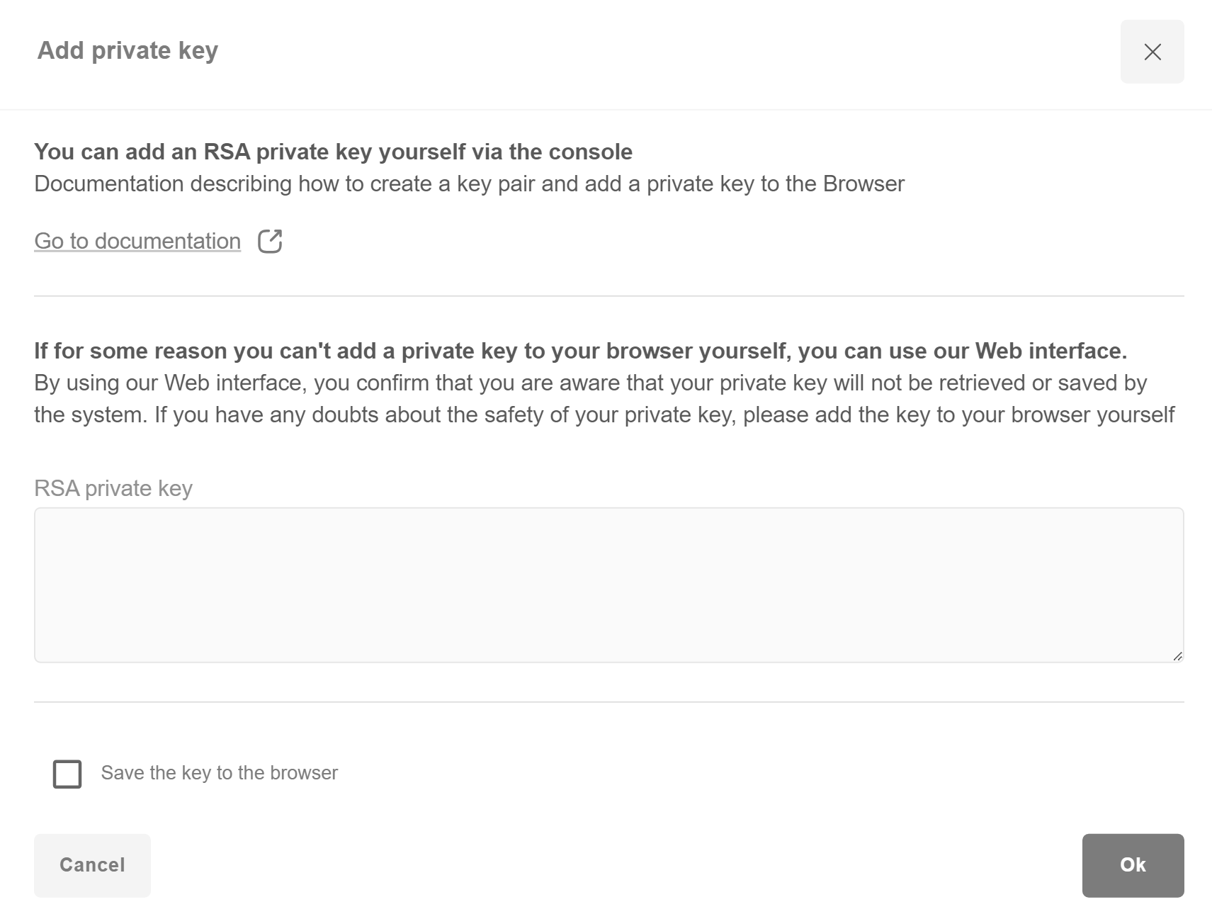 PKCS #8 RSA unencrypted private key in PEM format starts with —– BEGIN PRIVATE KEY —– text. This key must be imported to Browser Console or User Interface. See details below.
