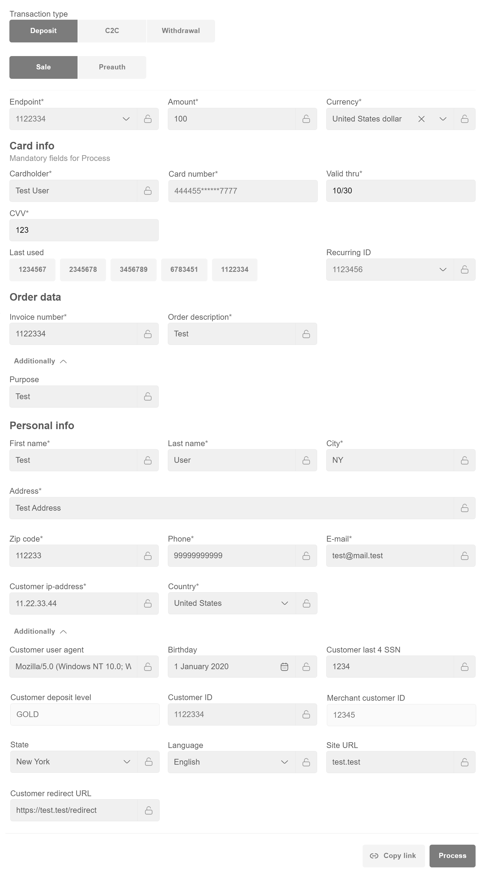 Sender data is retrieved using Recurring ID. The sender Card info (Cardholder, Card number, Valid thru) and Personal info (First name, Last name, City, Address, Zip code, Phone, E-mail, Customer IP-address, Country and other optional customer data) sections will be filled in automatically. CVV is not stored and must be requested from sender. To speed up the filling of sender fields, use the Last used section new to “Recurring ID” field, which contains previously used Recurring IDs. The Merchant creates a special link for the sender with “Copy link”. The sender receives the link to a form in which he fills the destination card number, then passes the 3DS check if needed.